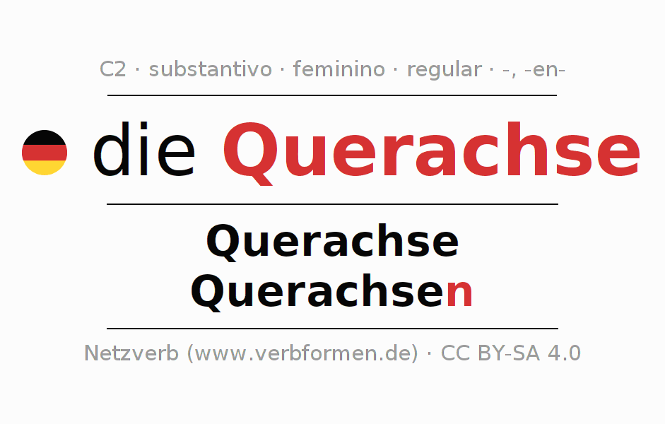 Declinação de Querachse é apresentada em uma tabela com todas as formas no singular e no plural (plural) e em todos os quatro casos: nominativo (1º caso), genitivo (2º caso), dativo (3º caso) e acusativo (4º caso) . Especialmente para os alunos de alemão, a correta declinação da palavra Querachse é fundamental.