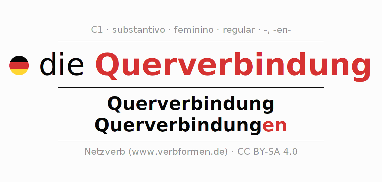 Declinação de Querverbindung é apresentada em uma tabela com todas as formas no singular e no plural (plural) e em todos os quatro casos: nominativo (1º caso), genitivo (2º caso), dativo (3º caso) e acusativo (4º caso) . Especialmente para os alunos de alemão, a correta declinação da palavra Querverbindung é fundamental.
