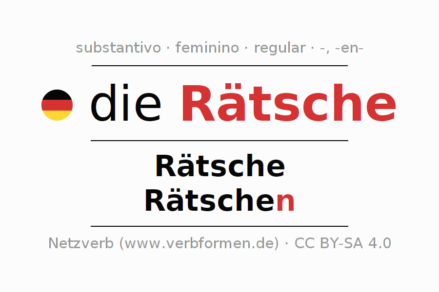 A declinação do substantivo Rätsche está no genitivo singular Rätsche e no nominativo plural Rätschen . O substantivo fraco Rätsche é declinado com a terminação -/n. O gênero gramatical de Rätsche é feminino e o artigo definido é "die". Não se pode somente declinar o substantivo Rätsche mas sim todos os substantivos em alemão. Comentários ☆