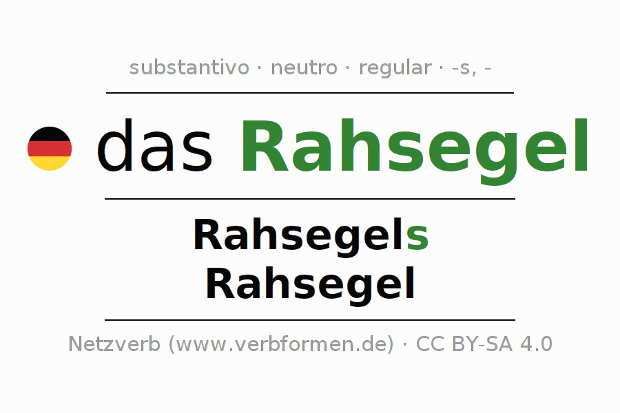 A declinação do substantivo Rahsegel (vela quadrada) está no genitivo singular Rahsegels e no nominativo plural Rahsegel . O substantivo forte Rahsegel é declinado com a terminação s/-. O gênero gramatical de Rahsegel é neutro e o artigo definido é "das". Não se pode somente declinar o substantivo Rahsegel mas sim todos os substantivos em alemão. Comentários ☆