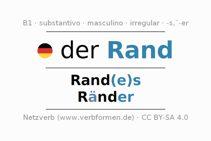 Declinação de Rand é apresentada em uma tabela com todas as formas no singular e no plural (plural) e em todos os quatro casos: nominativo (1º caso), genitivo (2º caso), dativo (3º caso) e acusativo (4º caso) . Especialmente para os alunos de alemão, a correta declinação da palavra Rand é fundamental.
