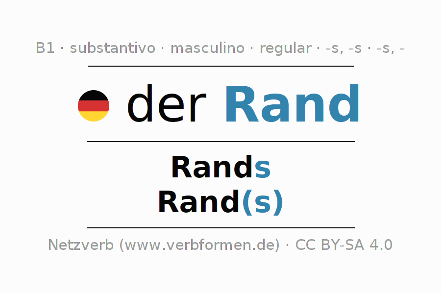 A declinação do substantivo Rand (rand) está no genitivo singular Rands e no nominativo plural Rand(s) . O substantivo forte Rand é declinado com a terminação s/s/-. Mas pode também ser usado para outros fins. O gênero gramatical de Rand é masculino e o artigo definido é 'der'. Não se pode somente declinar o substantivo Rand mas sim todos os substantivos em alemão. O substantivo faz parte do vocabulário referente ao Certificado em Alemão do Nível B1. Comentários ☆