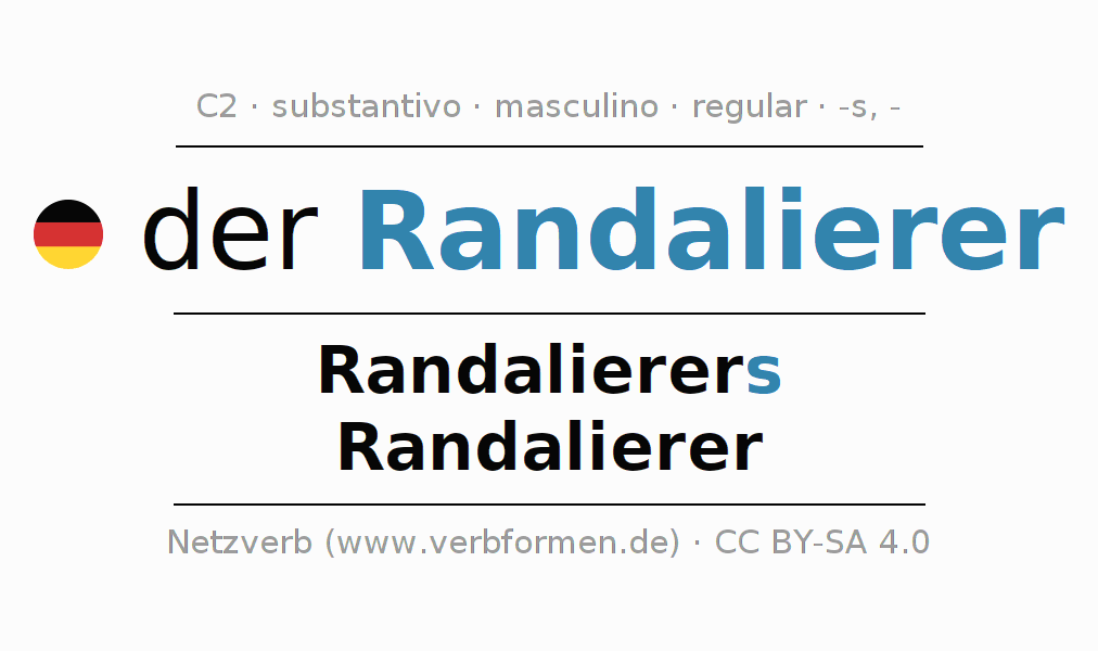 Declinação de Randalierer é apresentada em uma tabela com todas as formas no singular e no plural (plural) e em todos os quatro casos: nominativo (1º caso), genitivo (2º caso), dativo (3º caso) e acusativo (4º caso) . Especialmente para os alunos de alemão, a correta declinação da palavra Randalierer é fundamental.