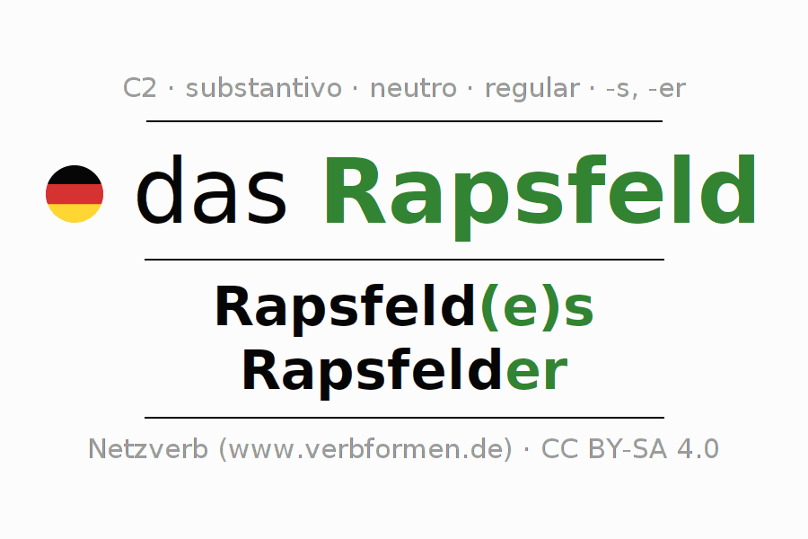 A declinação do substantivo Rapsfeld (campo de colza) está no genitivo singular Rapsfeld(e)s e no nominativo plural Rapsfelder . O substantivo forte Rapsfeld é declinado com a terminação es/er. O gênero gramatical de Rapsfeld é neutro e o artigo definido é "das". Não se pode somente declinar o substantivo Rapsfeld mas sim todos os substantivos em alemão. O substantivo faz parte do vocabulário referente ao Certificado em Alemão do Nível C2. Comentários ☆