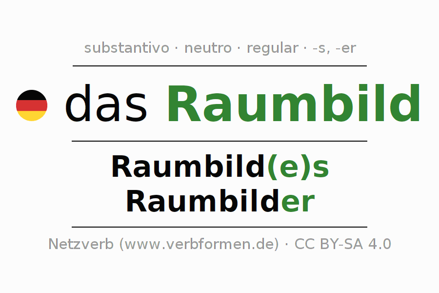 A declinação do substantivo Raumbild (imagem estereoscópica) está no genitivo singular Raumbild(e)s e no nominativo plural Raumbilder . O substantivo forte Raumbild é declinado com a terminação es/er. O gênero gramatical de Raumbild é neutro e o artigo definido é "das". Não se pode somente declinar o substantivo Raumbild mas sim todos os substantivos em alemão. Comentários ☆