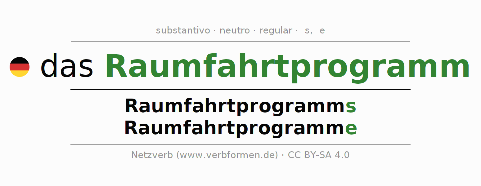 A declinação do substantivo Raumfahrtprogramm (programa espacial) está no genitivo singular Raumfahrtprogramms e no nominativo plural Raumfahrtprogramme . O substantivo forte Raumfahrtprogramm é declinado com a terminação s/e. O gênero gramatical de Raumfahrtprogramm é neutro e o artigo definido é "das". Não se pode somente declinar o substantivo Raumfahrtprogramm mas sim todos os substantivos em alemão. Comentários ☆
