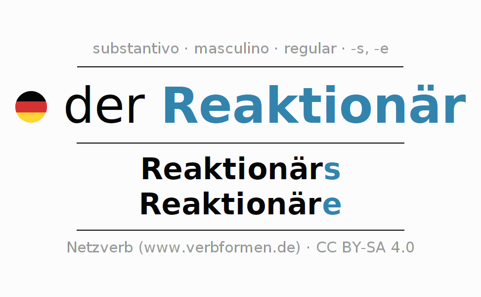 A declinação do substantivo Reaktionär (reacionário) está no genitivo singular Reaktionärs e no nominativo plural Reaktionäre . O substantivo forte Reaktionär é declinado com a terminação s/e. O gênero gramatical de Reaktionär é masculino e o artigo definido é 'der'. Não se pode somente declinar o substantivo Reaktionär mas sim todos os substantivos em alemão. Comentários ☆