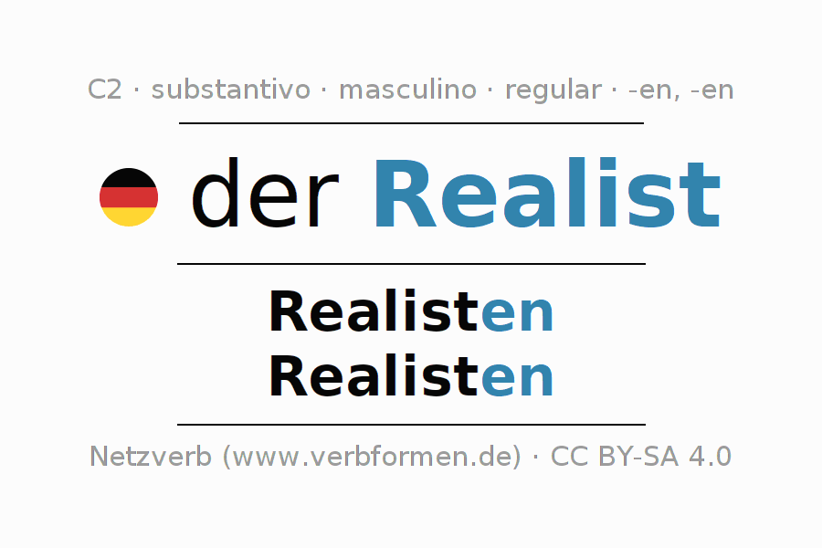 A declinação do substantivo Realist (realista) está no genitivo singular Realisten e no nominativo plural Realisten . O substantivo fraco Realist é declinado com a terminação en/en. O gênero gramatical de Realist é masculino e o artigo definido é 'der'. Não se pode somente declinar o substantivo Realist mas sim todos os substantivos em alemão. O substantivo faz parte do vocabulário referente ao Certificado em Alemão do Nível C2. Comentários ☆