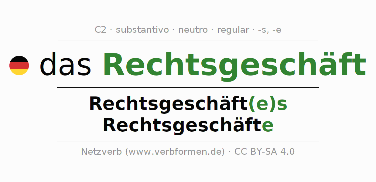 A declinação do substantivo Rechtsgeschäft (negócio jurídico, ato jurídico) está no genitivo singular Rechtsgeschäft(e)s e no nominativo plural Rechtsgeschäfte . O substantivo forte Rechtsgeschäft é declinado com a terminação es/e. O gênero gramatical de Rechtsgeschäft é neutro e o artigo definido é "das". Não se pode somente declinar o substantivo Rechtsgeschäft mas sim todos os substantivos em alemão. O substantivo faz parte do vocabulário referente ao Certificado em Alemão do Nível C2. Comentários ☆
