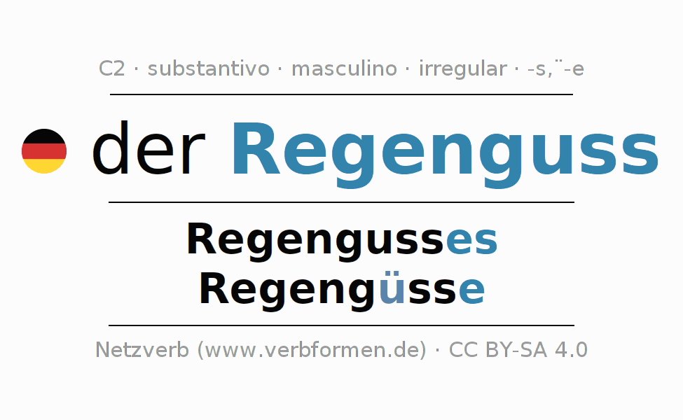 A declinação do substantivo Regenguss (aguaceiro, chuva forte) está no genitivo singular Regengusses e no nominativo plural Regengüsse . O substantivo forte Regenguss é declinado com a terminação es/ü-e. No plural com um trema. O gênero gramatical de Regenguss é masculino e o artigo definido é 'der'. Não se pode somente declinar o substantivo Regenguss mas sim todos os substantivos em alemão. O substantivo faz parte do vocabulário referente ao Certificado em Alemão do Nível C2. Comentários ☆