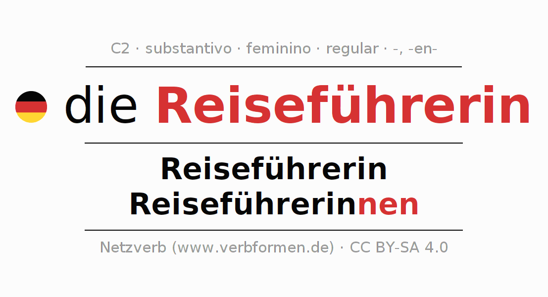 Declinação de Reiseführerin é apresentada em uma tabela com todas as formas no singular e no plural (plural) e em todos os quatro casos: nominativo (1º caso), genitivo (2º caso), dativo (3º caso) e acusativo (4º caso) . Especialmente para os alunos de alemão, a correta declinação da palavra Reiseführerin é fundamental.