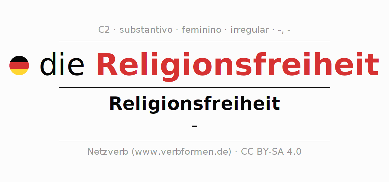 A declinação do substantivo Religionsfreiheit (liberdade religiosa, liberdade de culto) está no genitivo singular Religionsfreiheit e no nominativo plural - . O substantivo Religionsfreiheit é declinado com as terminações -/-. Não há formas no plural. O gênero gramatical de Religionsfreiheit é feminino e o artigo definido é "die". Não se pode somente declinar o substantivo Religionsfreiheit mas sim todos os substantivos em alemão. O substantivo faz parte do vocabulário referente ao Certificado em Alemão do Nível C2. Comentários ☆