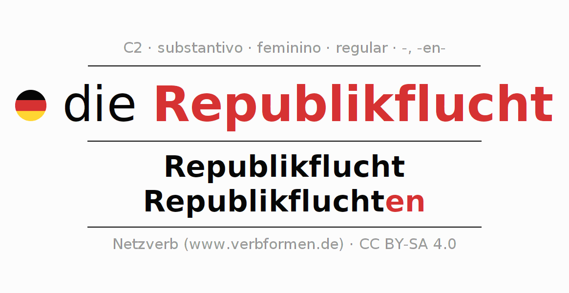 Declinação de Republikflucht é apresentada em uma tabela com todas as formas no singular e no plural (plural) e em todos os quatro casos: nominativo (1º caso), genitivo (2º caso), dativo (3º caso) e acusativo (4º caso) . Especialmente para os alunos de alemão, a correta declinação da palavra Republikflucht é fundamental.
