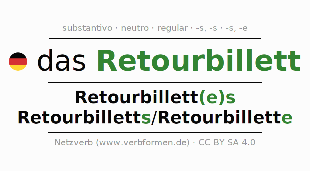 A declinação do substantivo Retourbillett está no genitivo singular Retourbillett(e)s e no nominativo plural Retourbilletts/Retourbillette . O substantivo forte Retourbillett é declinado com a terminação es/s/e. O gênero gramatical de Retourbillett é neutro e o artigo definido é "das". Não se pode somente declinar o substantivo Retourbillett mas sim todos os substantivos em alemão. Comentários ☆