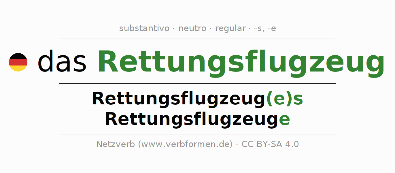 A declinação do substantivo Rettungsflugzeug (avião de resgate) está no genitivo singular Rettungsflugzeug(e)s e no nominativo plural Rettungsflugzeuge . O substantivo forte Rettungsflugzeug é declinado com a terminação es/e. O gênero gramatical de Rettungsflugzeug é neutro e o artigo definido é "das". Não se pode somente declinar o substantivo Rettungsflugzeug mas sim todos os substantivos em alemão. Comentários ☆
