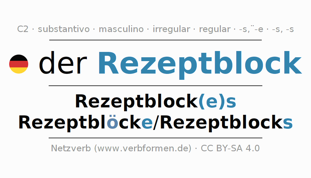 - Singular: der Rezeptblock, des Rezeptblock(e)s, dem Rezeptblock(e), den Rezeptblock