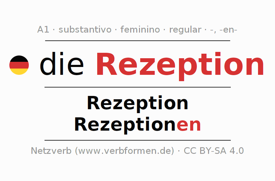 A declinação do substantivo Rezeption (recepção, acolhimento) está no genitivo singular Rezeption e no nominativo plural Rezeptionen . O substantivo fraco Rezeption é declinado com a terminação -/en. O gênero gramatical de Rezeption é feminino e o artigo definido é "die". Não se pode somente declinar o substantivo Rezeption mas sim todos os substantivos em alemão. O substantivo faz parte do vocabulário referente ao Certificado em Alemão do Nível A1. Comentários ☆