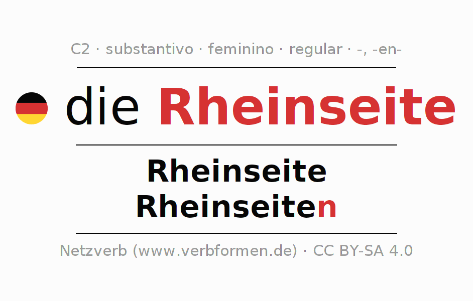 Declinação de Rheinseite é apresentada em uma tabela com todas as formas no singular e no plural (plural) e em todos os quatro casos: nominativo (1º caso), genitivo (2º caso), dativo (3º caso) e acusativo (4º caso) . Especialmente para os alunos de alemão, a correta declinação da palavra Rheinseite é fundamental.