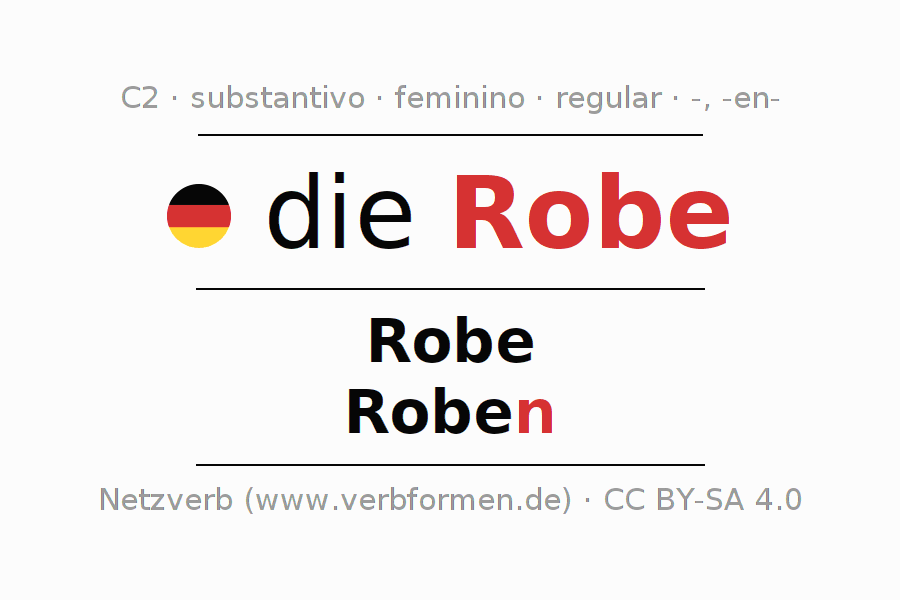 Declinação de Robe é apresentada em uma tabela com todas as formas no singular e no plural (plural) e em todos os quatro casos: nominativo (1º caso), genitivo (2º caso), dativo (3º caso) e acusativo (4º caso) . Especialmente para os alunos de alemão, a correta declinação da palavra Robe é fundamental.