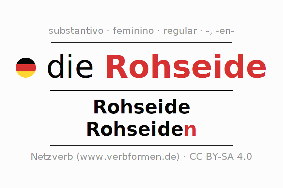Declinação de Rohseide é apresentada em uma tabela com todas as formas no singular e no plural (plural) e em todos os quatro casos: nominativo (1º caso), genitivo (2º caso), dativo (3º caso) e acusativo (4º caso) . Especialmente para os alunos de alemão, a correta declinação da palavra Rohseide é fundamental.