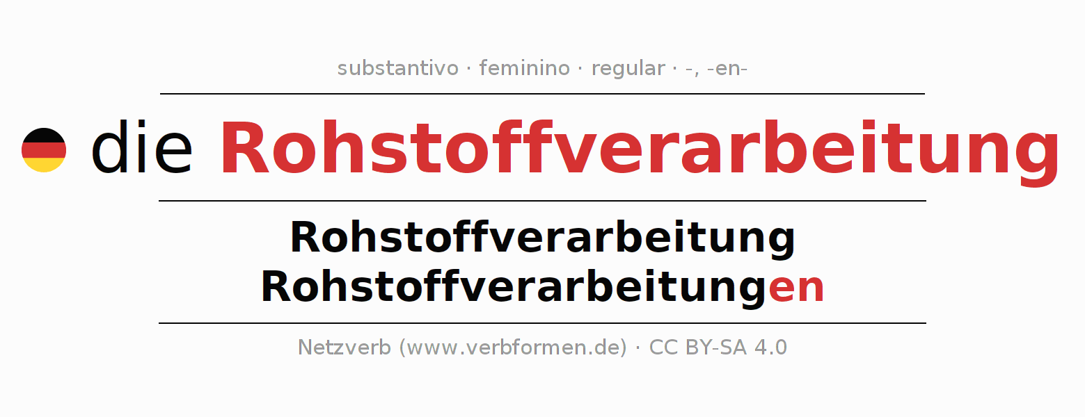 - Singular: die Rohstoffverarbeitung, der Rohstoffverarbeitung, der Rohstoffverarbeitung, die Rohstoffverarbeitung