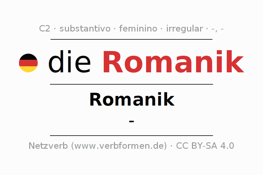 Declinação de Romanik é apresentada em uma tabela com todas as formas no singular e no plural (plural) e em todos os quatro casos: nominativo (1º caso), genitivo (2º caso), dativo (3º caso) e acusativo (4º caso) . Especialmente para os alunos de alemão, a correta declinação da palavra Romanik é fundamental.