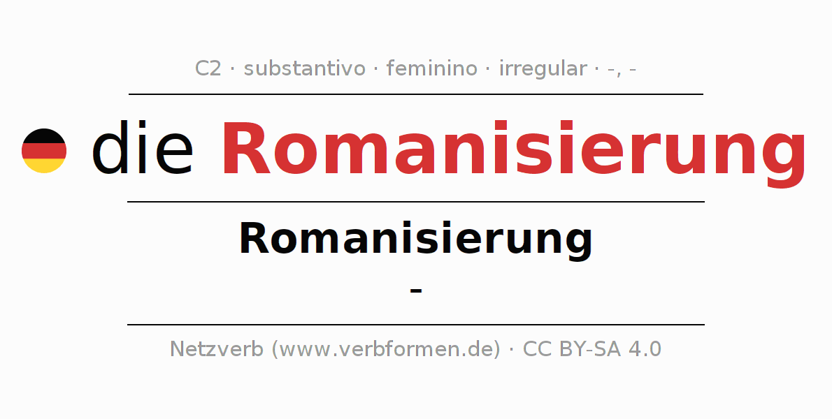 A declinação do substantivo Romanisierung (romanização) está no genitivo singular Romanisierung e no nominativo plural - . O substantivo Romanisierung é declinado com as terminações -/-. Não há formas no plural. O gênero gramatical de Romanisierung é feminino e o artigo definido é "die". Não se pode somente declinar o substantivo Romanisierung mas sim todos os substantivos em alemão. O substantivo faz parte do vocabulário referente ao Certificado em Alemão do Nível C2. Comentários ☆