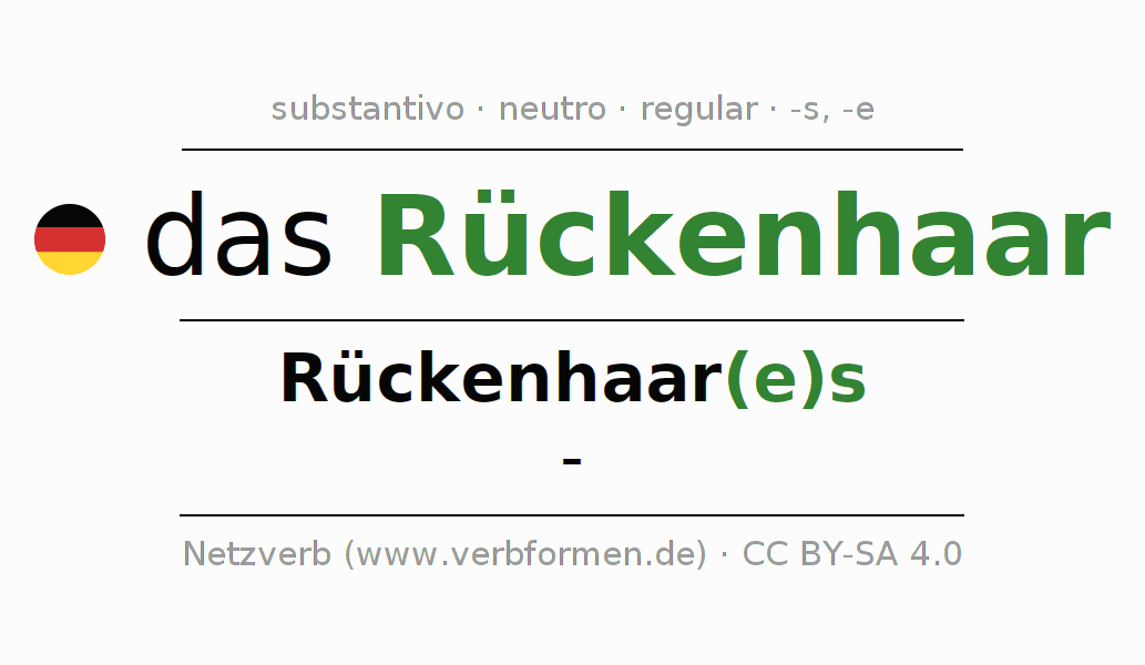 A declinação do substantivo Rückenhaar (pelos das costas) está no genitivo singular Rückenhaar(e)s e no nominativo plural - . O substantivo forte Rückenhaar é declinado com a terminação es/-. Não há formas no plural. O gênero gramatical de Rückenhaar é neutro e o artigo definido é "das". Não se pode somente declinar o substantivo Rückenhaar mas sim todos os substantivos em alemão. Comentários ☆