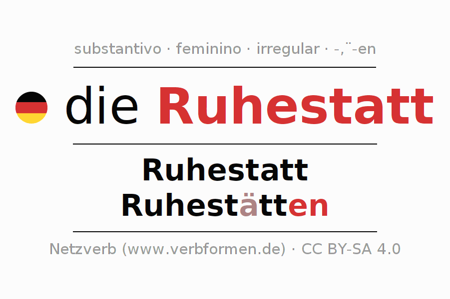A declinação do substantivo Ruhestatt (local de sepultamento, lugar de descanso) está no genitivo singular Ruhestatt e no nominativo plural Ruhestätten . O substantivo forte Ruhestatt é declinado com a terminação -/ä-en. Mas pode também ser usado para outros fins. No plural com um trema. O gênero gramatical de Ruhestatt é feminino e o artigo definido é "die". Não se pode somente declinar o substantivo Ruhestatt mas sim todos os substantivos em alemão. Comentários ☆