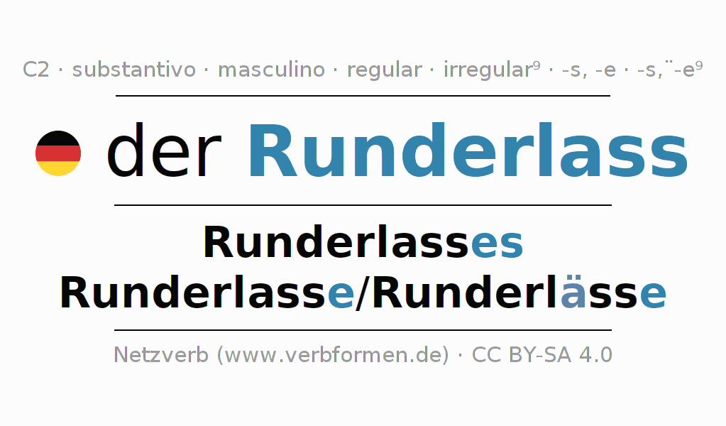 Declinação de Runderlass é apresentada em uma tabela com todas as formas no singular e no plural (plural) e em todos os quatro casos: nominativo (1º caso), genitivo (2º caso), dativo (3º caso) e acusativo (4º caso) . Especialmente para os alunos de alemão, a correta declinação da palavra Runderlass é fundamental.