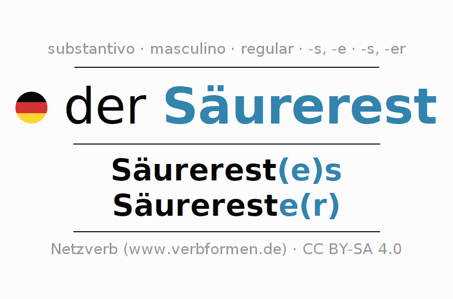 A declinação do substantivo Säurerest (ânion) está no genitivo singular Säurerest(e)s e no nominativo plural Säurereste(r) . O substantivo forte Säurerest é declinado com a terminação es/e/er. O gênero gramatical de Säurerest é masculino e o artigo definido é 'der'. Não se pode somente declinar o substantivo Säurerest mas sim todos os substantivos em alemão. Comentários ☆
