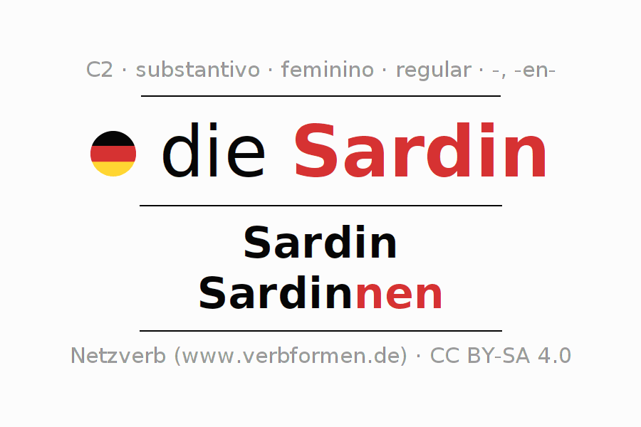Declinação de Sardin é apresentada em uma tabela com todas as formas no singular e no plural (plural) e em todos os quatro casos: nominativo (1º caso), genitivo (2º caso), dativo (3º caso) e acusativo (4º caso) . Especialmente para os alunos de alemão, a correta declinação da palavra Sardin é fundamental.