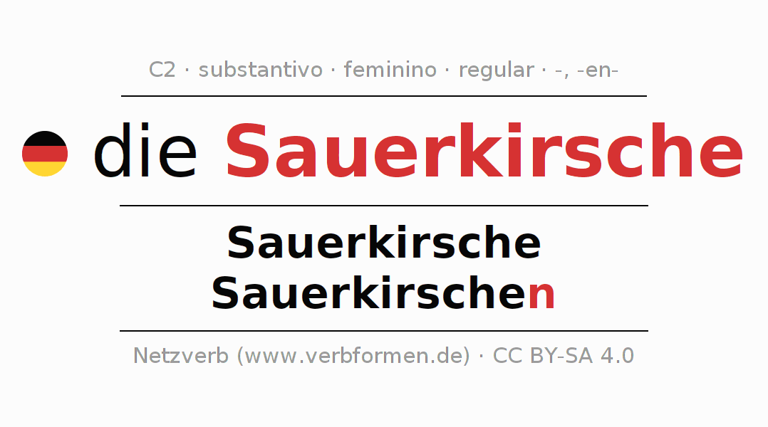 Declinação de Sauerkirsche é apresentada em uma tabela com todas as formas no singular e no plural (plural) e em todos os quatro casos: nominativo (1º caso), genitivo (2º caso), dativo (3º caso) e acusativo (4º caso) . Especialmente para os alunos de alemão, a correta declinação da palavra Sauerkirsche é fundamental.