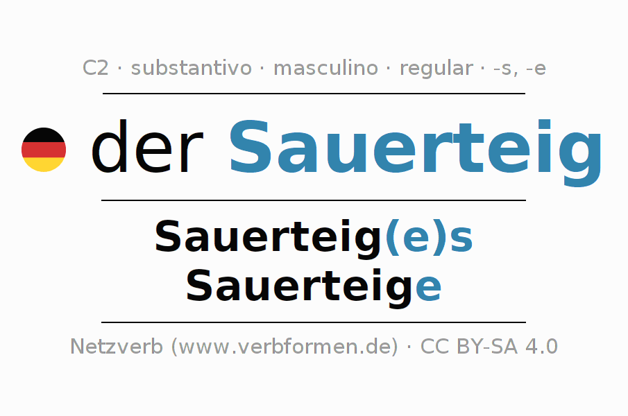Declinação de Sauerteig é apresentada em uma tabela com todas as formas no singular e no plural (plural) e em todos os quatro casos: nominativo (1º caso), genitivo (2º caso), dativo (3º caso) e acusativo (4º caso) . Especialmente para os alunos de alemão, a correta declinação da palavra Sauerteig é fundamental.