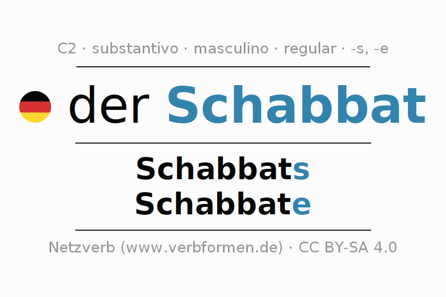 Declinação de Schabbat é apresentada em uma tabela com todas as formas no singular e no plural (plural) e em todos os quatro casos: nominativo (1º caso), genitivo (2º caso), dativo (3º caso) e acusativo (4º caso) . Especialmente para os alunos de alemão, a correta declinação da palavra Schabbat é fundamental.