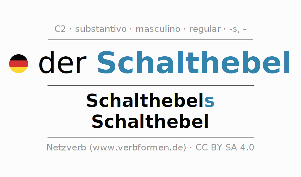 A declinação do substantivo Schalthebel (alavanca de câmbio, alavanca das velocidades) está no genitivo singular Schalthebels e no nominativo plural Schalthebel . O substantivo forte Schalthebel é declinado com a terminação s/-. O gênero gramatical de Schalthebel é masculino e o artigo definido é 'der'. Não se pode somente declinar o substantivo Schalthebel mas sim todos os substantivos em alemão. O substantivo faz parte do vocabulário referente ao Certificado em Alemão do Nível C2. Comentários ☆