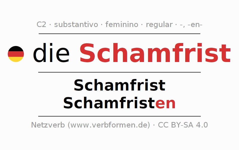 Declinação de Schamfrist é apresentada em uma tabela com todas as formas no singular e no plural (plural) e em todos os quatro casos: nominativo (1º caso), genitivo (2º caso), dativo (3º caso) e acusativo (4º caso) . Especialmente para os alunos de alemão, a correta declinação da palavra Schamfrist é fundamental.
