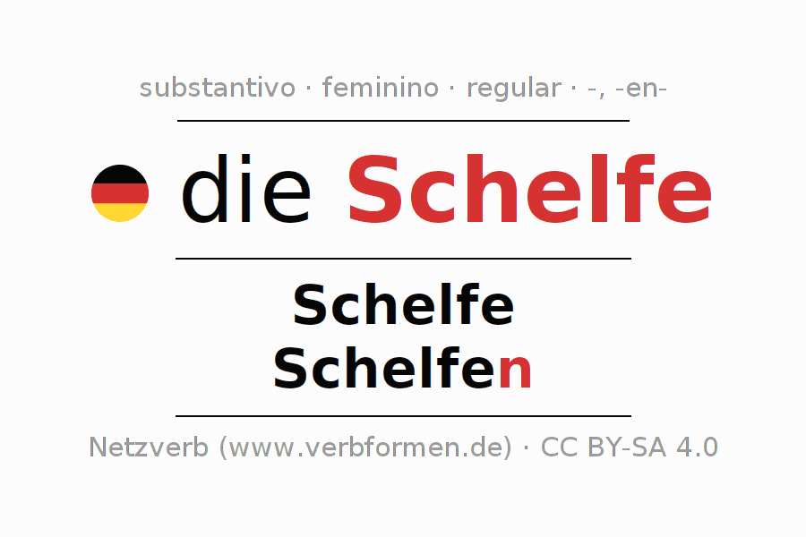 A declinação do substantivo Schelfe está no genitivo singular Schelfe e no nominativo plural Schelfen . O substantivo fraco Schelfe é declinado com a terminação -/n. O gênero gramatical de Schelfe é feminino e o artigo definido é "die". Não se pode somente declinar o substantivo Schelfe mas sim todos os substantivos em alemão. Comentários ☆