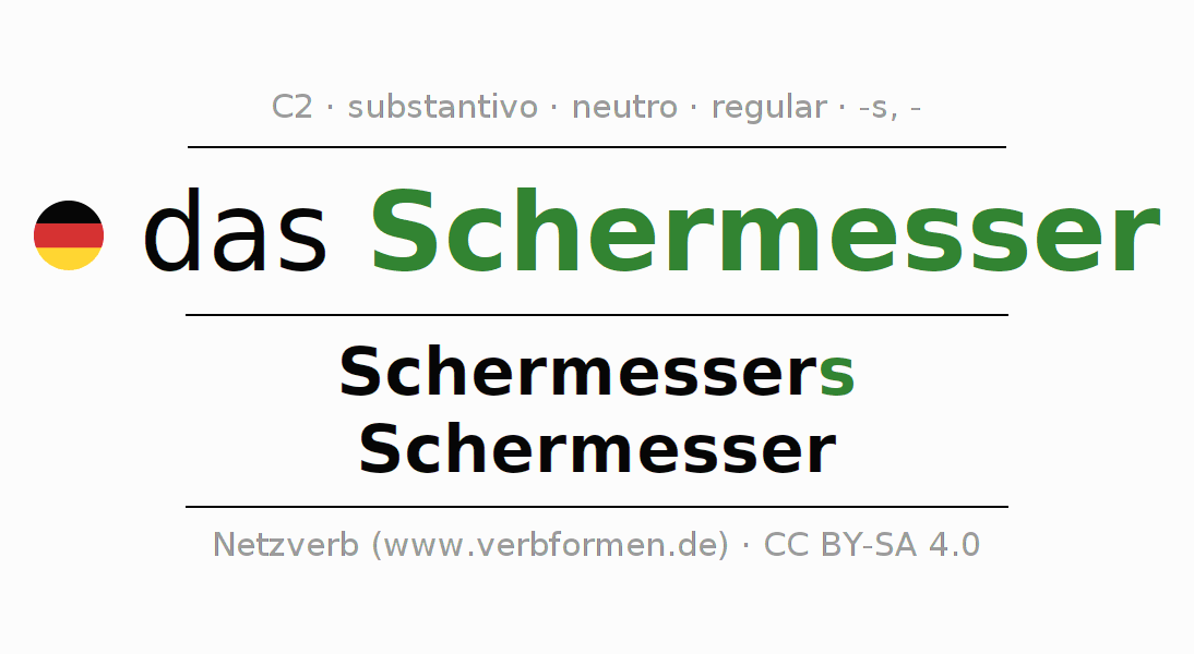 Declinação de Schermesser é apresentada em uma tabela com todas as formas no singular e no plural (plural) e em todos os quatro casos: nominativo (1º caso), genitivo (2º caso), dativo (3º caso) e acusativo (4º caso) . Especialmente para os alunos de alemão, a correta declinação da palavra Schermesser é fundamental.