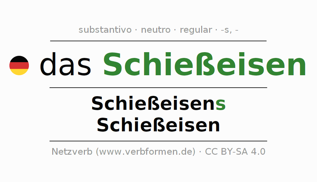A declinação do substantivo Schießeisen (arma de fogo) está no genitivo singular Schießeisens e no nominativo plural Schießeisen . O substantivo forte Schießeisen é declinado com a terminação s/-. O gênero gramatical de Schießeisen é neutro e o artigo definido é "das". Não se pode somente declinar o substantivo Schießeisen mas sim todos os substantivos em alemão. Comentários ☆