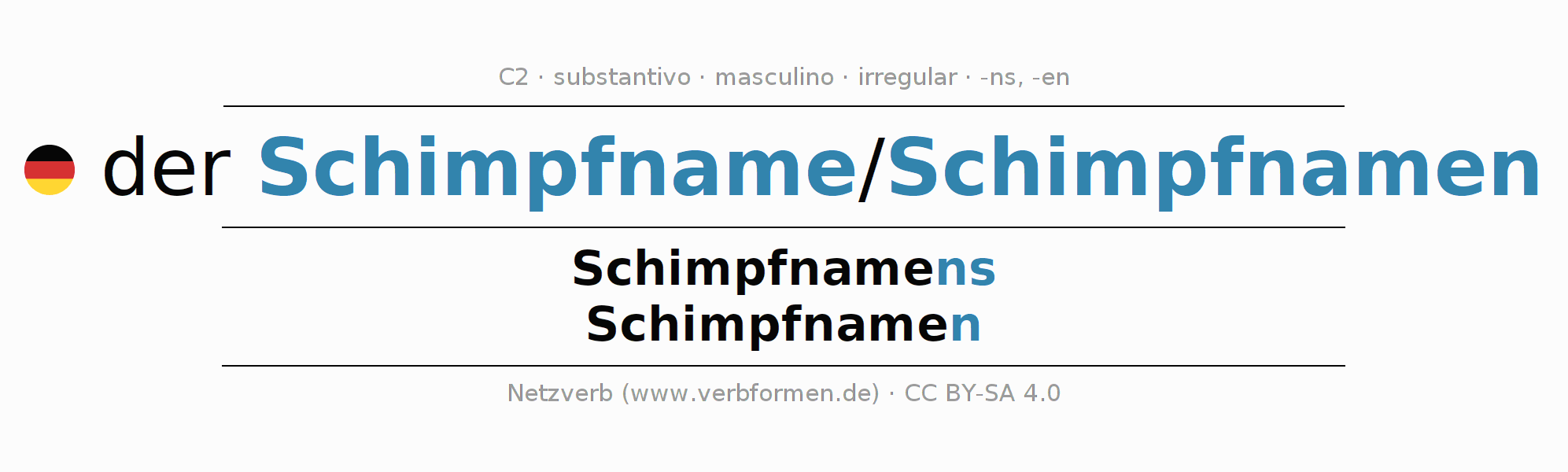 Declinação de Schimpfname é apresentada em uma tabela com todas as formas no singular e no plural (plural) e em todos os quatro casos: nominativo (1º caso), genitivo (2º caso), dativo (3º caso) e acusativo (4º caso) . Especialmente para os alunos de alemão, a correta declinação da palavra Schimpfname é fundamental.