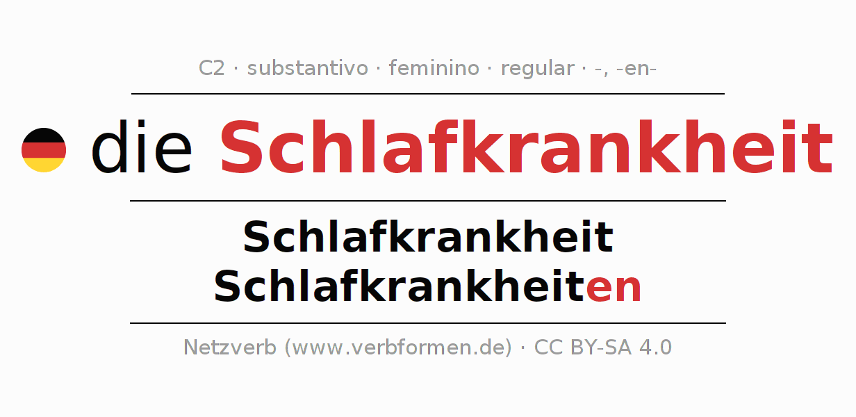 Declinação de Schlafkrankheit é apresentada em uma tabela com todas as formas no singular e no plural (plural) e em todos os quatro casos: nominativo (1º caso), genitivo (2º caso), dativo (3º caso) e acusativo (4º caso) . Especialmente para os alunos de alemão, a correta declinação da palavra Schlafkrankheit é fundamental.