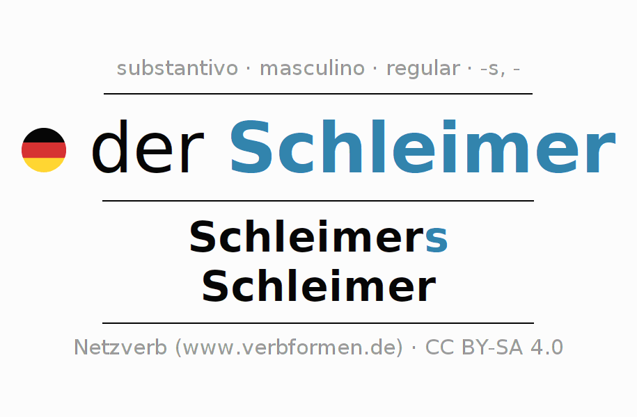 Declinação de Schleimer é apresentada em uma tabela com todas as formas no singular e no plural (plural) e em todos os quatro casos: nominativo (1º caso), genitivo (2º caso), dativo (3º caso) e acusativo (4º caso) . Especialmente para os alunos de alemão, a correta declinação da palavra Schleimer é fundamental.