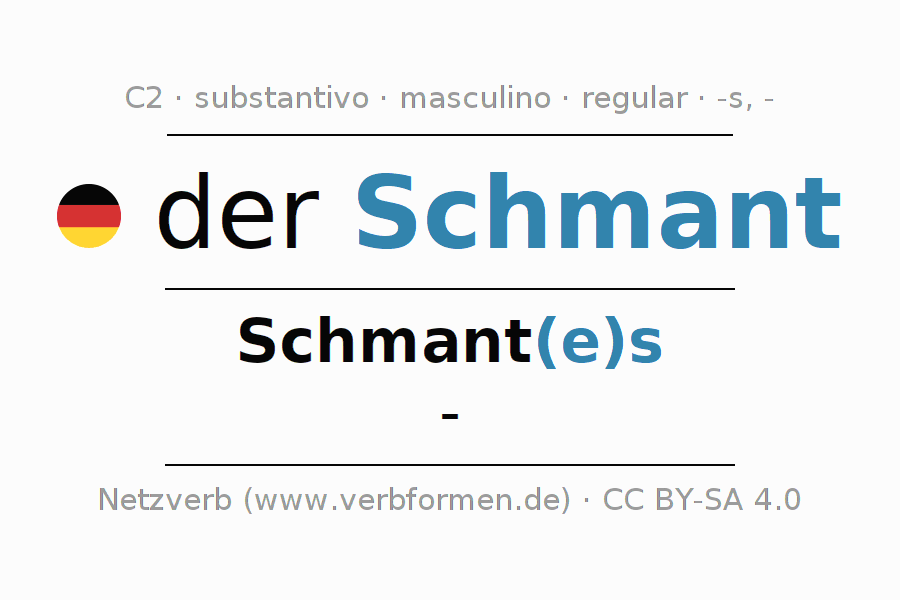 Declinação de Schmant é apresentada em uma tabela com todas as formas no singular e no plural (plural) e em todos os quatro casos: nominativo (1º caso), genitivo (2º caso), dativo (3º caso) e acusativo (4º caso) . Especialmente para os alunos de alemão, a correta declinação da palavra Schmant é fundamental.