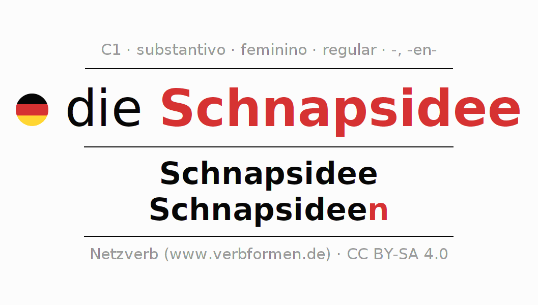 Declinação de Schnapsidee é apresentada em uma tabela com todas as formas no singular e no plural (plural) e em todos os quatro casos: nominativo (1º caso), genitivo (2º caso), dativo (3º caso) e acusativo (4º caso) . Especialmente para os alunos de alemão, a correta declinação da palavra Schnapsidee é fundamental.