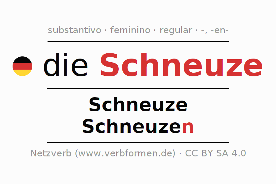 Declinação de Schneuze é apresentada em uma tabela com todas as formas no singular e no plural (plural) e em todos os quatro casos: nominativo (1º caso), genitivo (2º caso), dativo (3º caso) e acusativo (4º caso) . Especialmente para os alunos de alemão, a correta declinação da palavra Schneuze é fundamental.