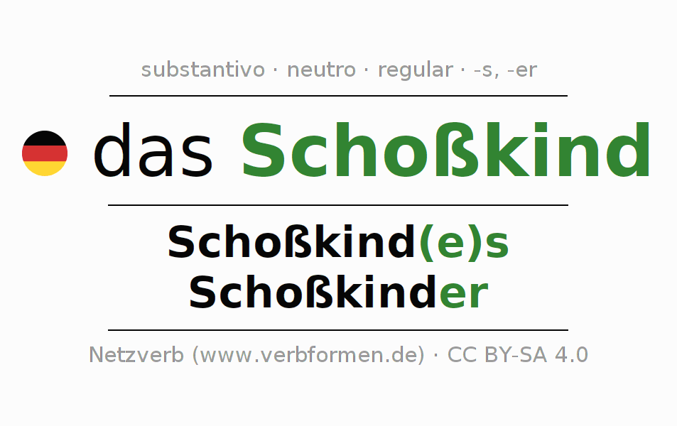 A declinação do substantivo Schoßkind (filho mimado) está no genitivo singular Schoßkind(e)s e no nominativo plural Schoßkinder . O substantivo forte Schoßkind é declinado com a terminação es/er. O gênero gramatical de Schoßkind é neutro e o artigo definido é "das". Não se pode somente declinar o substantivo Schoßkind mas sim todos os substantivos em alemão. Comentários ☆