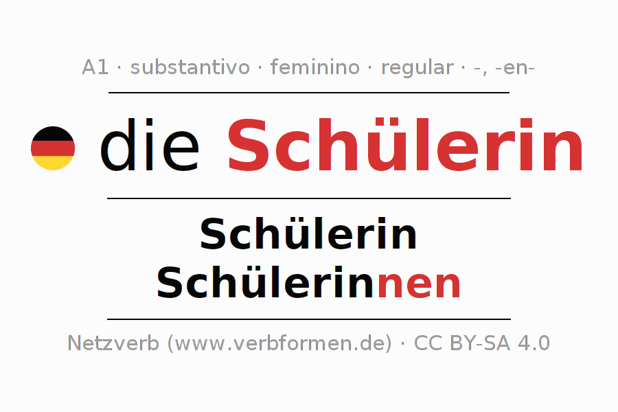 Declinação de Schülerin é apresentada em uma tabela com todas as formas no singular e no plural (plural) e em todos os quatro casos: nominativo (1º caso), genitivo (2º caso), dativo (3º caso) e acusativo (4º caso) . Especialmente para os alunos de alemão, a correta declinação da palavra Schülerin é fundamental.
