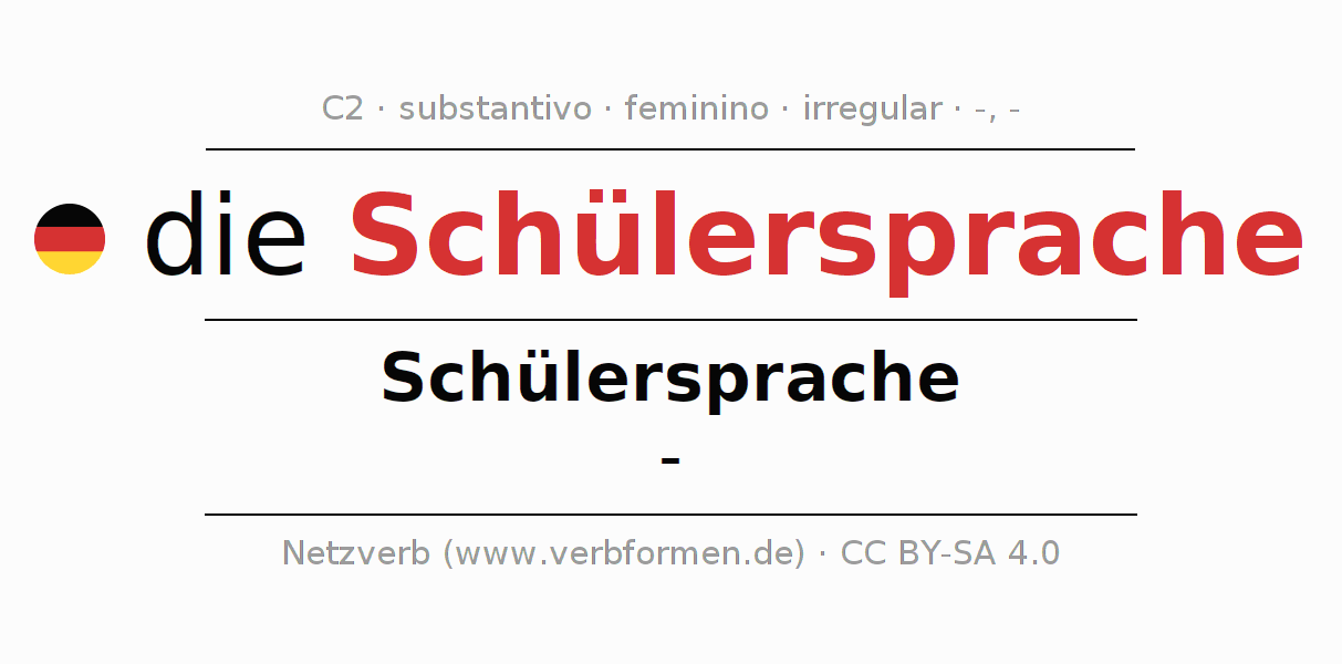 A declinação do substantivo Schülersprache (linguagem dos alunos, linguagem estudantil) está no genitivo singular Schülersprache e no nominativo plural - . O substantivo Schülersprache é declinado com as terminações -/-. Não há formas no plural. O gênero gramatical de Schülersprache é feminino e o artigo definido é "die". Não se pode somente declinar o substantivo Schülersprache mas sim todos os substantivos em alemão. O substantivo faz parte do vocabulário referente ao Certificado em Alemão do Nível C2. Comentários ☆