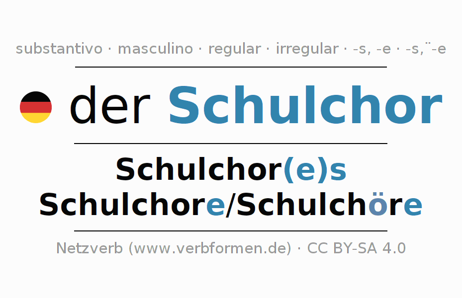 A declinação do substantivo Schulchor (coral escolar) está no genitivo singular Schulchor(e)s e no nominativo plural Schulchore/Schulchöre . O substantivo forte Schulchor é declinado com a terminação es/e/ö-e. No plural com um trema. O gênero gramatical de Schulchor é masculino e o artigo definido é 'der'. Não se pode somente declinar o substantivo Schulchor mas sim todos os substantivos em alemão. Comentários ☆